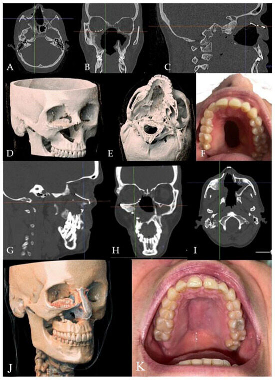 (A–E) Radiographic and 3D reconstruction using InVivo6® and Anatomage Table EDU vers.8® (Santa Clara, CA, USA) software. DICOM files were imported in InVivo® (California, USA) software to obtain the axial, cross, and panorex sections. Afterwards, the DICOM files were imported into Anatomage Table® (Santa Clara, CA, USA) to obtain the 3D rendering. (F) Clinical presentation of the oro-nasal communication. (G–J) Radiographic and 3D reconstructions using InVivo6® and Anatomage Table EDU vers.8® (Santa Clara, CA, USA) software at the one-year follow-up. (K) One-year clinical follow-up.