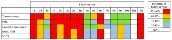 There were notable variations in the frequency of postoperative follow-up depending on the type of surgery performed. Trabeculectomy requires the most frequent early postoperative visits, which is appropriate because of the higher risk of complications (e.g., bleb leaks, hypotony, and infections) and the need for proactive and reactive bleb management to achieve better postoperative outcomes [27,28]. In contrast, PMS and long-tube shunt surgeries require fewer early follow-up visits, likely due to their more predictable postoperative course. Meanwhile, MIGS procedures, including the iStent inject W and the HMS, require the least frequent follow-up because of their minimally invasive nature and rapid recovery time.