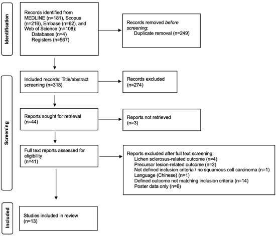In total, 567 database entries were retrieved, and 249 duplicates were removed. The abstracts of 318 records were screened using our a priori defined inclusion criteria, and 274 records were excluded, after which 44 publications were sought for retrieval and the full texts of 41 publications were assessed for eligibility; thereby, 28 reports were excluded ([21,22,23,24,25,26,27,28,29,30,31,32,33,34,35,36,37,38,39,40,41,42,43,44,45,46,47,48]) and 13 reports ([49,50,51,52,53,54,55,56,57,58,59,60,61]) were included in this study. See Figure 1 for a flow diagram presenting the study selection. Figure 2 presents the results of bias assessment. Regarding bias, 5 out of 13 studies were at low risk of bias, 6 were at middle risk, while 2 were at high risk. The technical details of the ki-67 staining protocols are depicted in Supplementary Table S3.