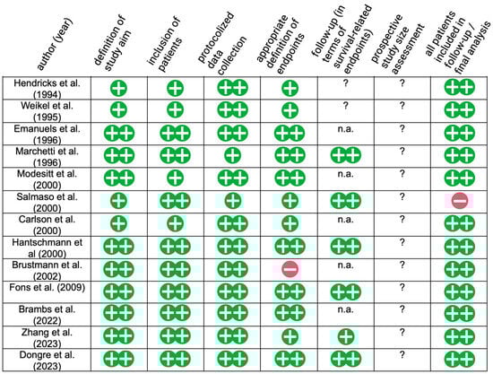Initial assessment of study quality was employed using a “mixed-criteria” two-step screening approach (study participation, prognostic factor measurement, outcome measurement, analysis) in which eligible studies were screened for relevant quality items; see Supplementary Table S2 [18]. In order to systematically assess the risk of bias in each study, the Methodological Index for Non-Randomized Studies (MINORS) protocol was employed using 7 items: (1) definition of a clear aim, (2) inclusion of patients, (3) protocolized data collection, (4) appropriate definition of endpoints, (5) follow-up (>/< 5 years), (6) prospective study size assessment, and (7) patients included in follow-up/final analysis [19]. In cases of incomplete result presentation, studies were extra highlighted to assess risk of bias due to missing results [20]. Incongruences were resolved by consensus-reaching discussion of the subject by all authors.