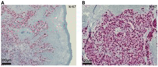 Based on initial analysis of ki-67 pattern distributions in bladder cancer, as well as reports employing protease cathepsin-D and pro-cathepsin-L staining within a cohort of vulvar carcinomas, early studies defined two patterns of ki-67 staining on vulva carcinomas: a “localized” distribution of ki-67-positive nuclei restricted to basilar components of tumor clusters and a “diffuse” pattern, with ki-67-positive nuclei spreading universally all over the tumor mass [49,62,63]. Figure 3 shows both types of staining distributions in an exemplary manner. In 2000, Hantschmann et al. further subdivided the localized pattern. The already-defined localized pattern was named “basal type”; in case staining primarily occurs at the tumor invasion front, the pattern was defined as “infiltrative type” [56]. Brambs et al. (2022) [59] then again re-defined three patterns of ki-67 staining based on previous findings in penile squamous cell carcinoma and, in comparison to the physiological vulva epithelium: “Low-grade patterns” in the case of ki-67-positive nuclei were solely based on the outer cell layers of tumor clusters, “intermediate patterns” if ki-67-positive nuclei extended from the infiltrating zone to the tumor centrum, and “high-grade patterns” in the case of diffuse positive intratumoral staining [64].