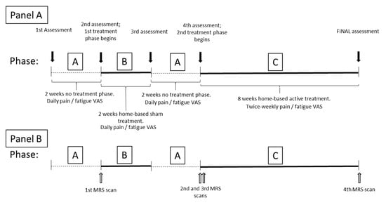 - A = no intervention observational period: Daily patient diary (visual analogue scale; VAS) of fatigue and pain to understand usual (baseline) behaviour of fatigue and pain symptoms, to compare with any change during/after intervention. Fourteen data points will be obtained in each non-intervention period. In this study, the repeated “A” period will also serve as a washout period after the sham phase, to account for any placebo response.