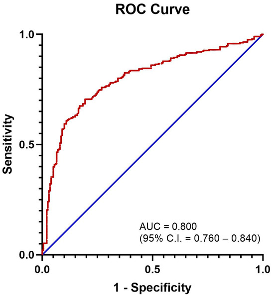 ROC curve for NLR in predicting severe–critical COVID-19. Area under curve = 0.800 (95% C.I. = 0.760–0.840).