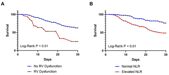 Kaplan–Meier 30-day survival curves by (A) presence of RV dysfunction (p < 0.01) and (B) presence of elevated NLR (p < 0.01).