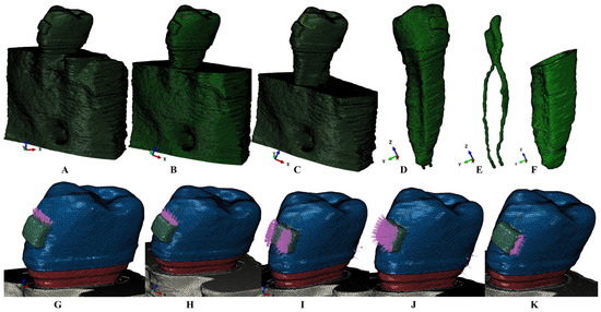 Mesh model of one of nine 3D models: (A) second lower right premolar model with 1 mm horizontal periodontal breakdown intact periodontium, (B) 4 mm bone loss model, (C) 8 mm bone loss model, (D) second lower premolar with the NVB and pulp, (E) the dental pulp and NVB of the second lower premolar, and (F) the PDL with 1 mm tissular loss. Applied vectors: (G) extrusion, (H) intrusion, (I) rotation, (J) tipping, and (K) translation.