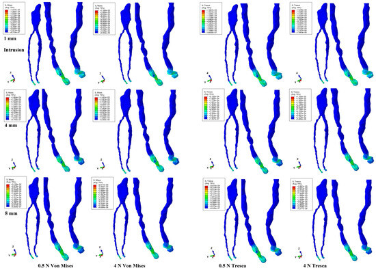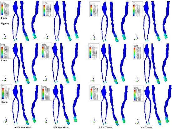 Intrusion movement for 1, 4, and 8 mm periodontal breakdown—comparative stress distribution in one of the nine 3D models using the Von Mises and Tresca numerical methods, for 0.5 and 4 N applied forces.