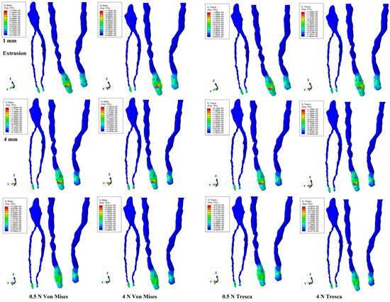 Extrusion movement for 1, 4, and 8 mm periodontal breakdown—comparative stress distribution in one of the nine 3D models using the Von Mises and Tresca numerical methods, for 0.5 and 4 N applied forces.