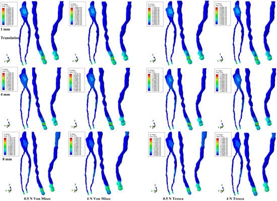 Translation movement for 1, 4, and 8 mm periodontal breakdown—comparative stress distribution in one of the nine 3D models using the Von Mises and Tresca numerical methods, for 0.5 and 4 N applied forces.