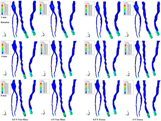 Rotation movement for 1, 4, and 8 mm periodontal breakdown—comparative stress distribution in one of the nine 3D models using the Von Mises and Tresca numerical methods, for 0.5 and 4 N applied forces.