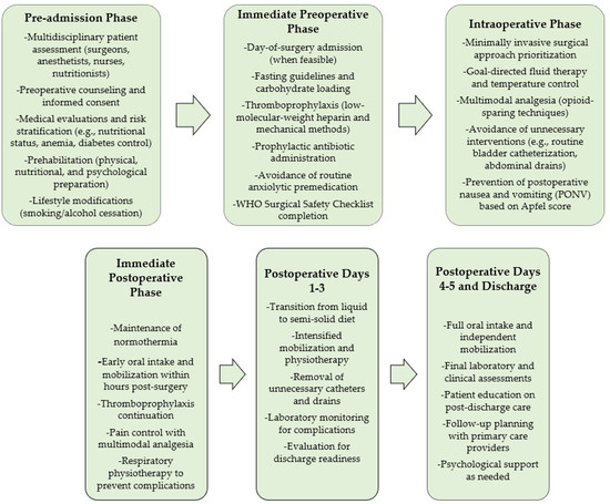 - Preoperative phase: This phase emphasized comprehensive patient assessment, including nutritional evaluation, risk stratification, and psychological support. Multidisciplinary teams comprising surgeons, anesthesiologists, nurses, and dietitians worked collaboratively to optimize patient readiness through preoperative education, carbohydrate loading, and prophylactic measures to reduce surgical site infections and thromboembolic risks.