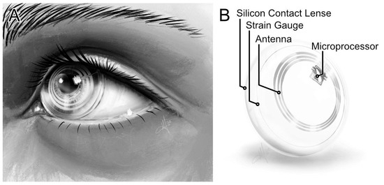 Contact lens sensor. (A) Placed CLS. (B) Components of the CLS.