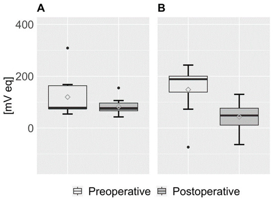 The statistics of the study population showed an amplitude of the CLS cosine analysis of 119.59 ± 82.40 mV eq with a median of 77.13 mV eq preoperatively and 83.34 ± 32.81 mV eq with a median of 75.66 postoperatively, which was not statistically significant (p > 0.05). The MESOR was 148.58 ± 96.37 mV eq preoperatively with a median of 188.42 mV eq and 43.06 ± 55.18 mV eq postoperatively with a median of 48.46 mV eq, which was statistically significant (p < 0.05) (Figure 2).