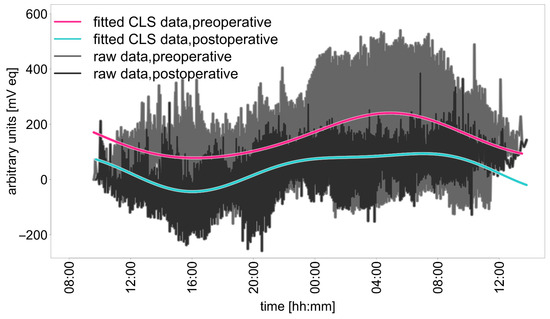 We detected the acrophase, the nocturnal maximum value of the circadian rhythm, at night preoperatively in eight patients and postoperatively in seven patients. One participant in the study diagnosed with POAG had an acrophase at 3:51 a.m. before TE and at 2:09 a.m. after TE. Another POAG participant had an acrophase at 9:03 a.m., down from 4:11 a.m. before TE. In contrast, a participant with NTG had an acrophase at 9:32 a.m., which was later than the 10:15 p.m. acrophase observed prior to surgery. The remaining two individuals in this trial with NTG showed acrophases during nighttime hours, showing no significant changes before and after the surgical procedure. On average, we could observe the acrophase at 08:12 [hh:mm] before and at 08:13 [hh:mm] after surgery. In all patients, a periodicity in the compensation curve of 24 h could be observed, which corresponds to circadian rhythmicity. The graphical analysis also confirmed the above observation (Figure 2). The fitted CLS data of all patients show that not the amplitude but the MESOR statistically significantly decreased after surgery. In addition, it can be seen from the compensation curve that a flattened increase in the night phase occurred postoperatively until the maximum was reached (Figure 3).