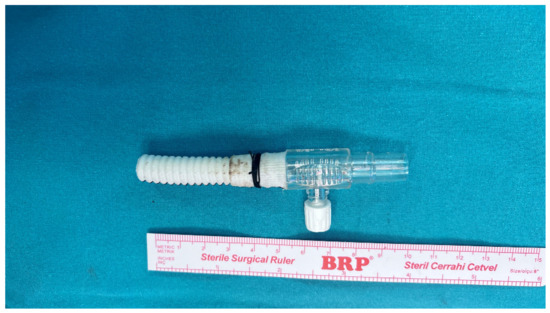 The pericardium was opened, and the innominate vein (IV) was looped with two tapes. The entire aorta and its arch branches were explored, with only the IA being looped. A 5 cm long, 10 mm Dacron graft (Jotec FlowWeave BIOSEAL vascular graft®, Jotec GmbH, Hechingen, Germany) was attached to a 3/8-inch connector (Figure 2). After the administration of 300 IU/kg heparin, ensuring an activated clotting time (ACT) > 400 s, a partial side clamp was applied to the mid-segment of the IA. An incision was made on the IA, and the graft was anastomosed using a 6/0 polypropylene suture with a continuous technique reinforced with a Teflon felt. After removing the side clamp and ensuring air evacuation, the prepared graft was directly connected to the arterial return line via a 3/8-inch connector (Figure 3).