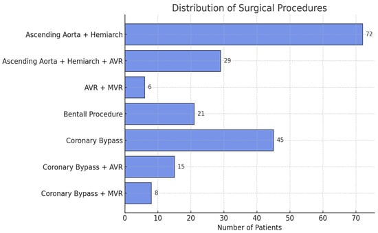 The surgical procedures performed are presented in Table 2 and Figure 4. The most frequently performed surgical procedure was ascending aortic and hemiarch replacement in 72 patients (36.74%). Among MFS patients, the most common procedure was the Bentall operation, performed in 10 patients (43.48%). The median intraoperative times were recorded as follows: CPB time: 120.5 min (IQR: 81.75–154), cross-clamp time: 93 min (IQR: 61–131.25), and SACP time: 23 min (IQR: 20.75–24.25). The mean CPB flow rate was calculated as 4.54 ± 0.42 L/min.