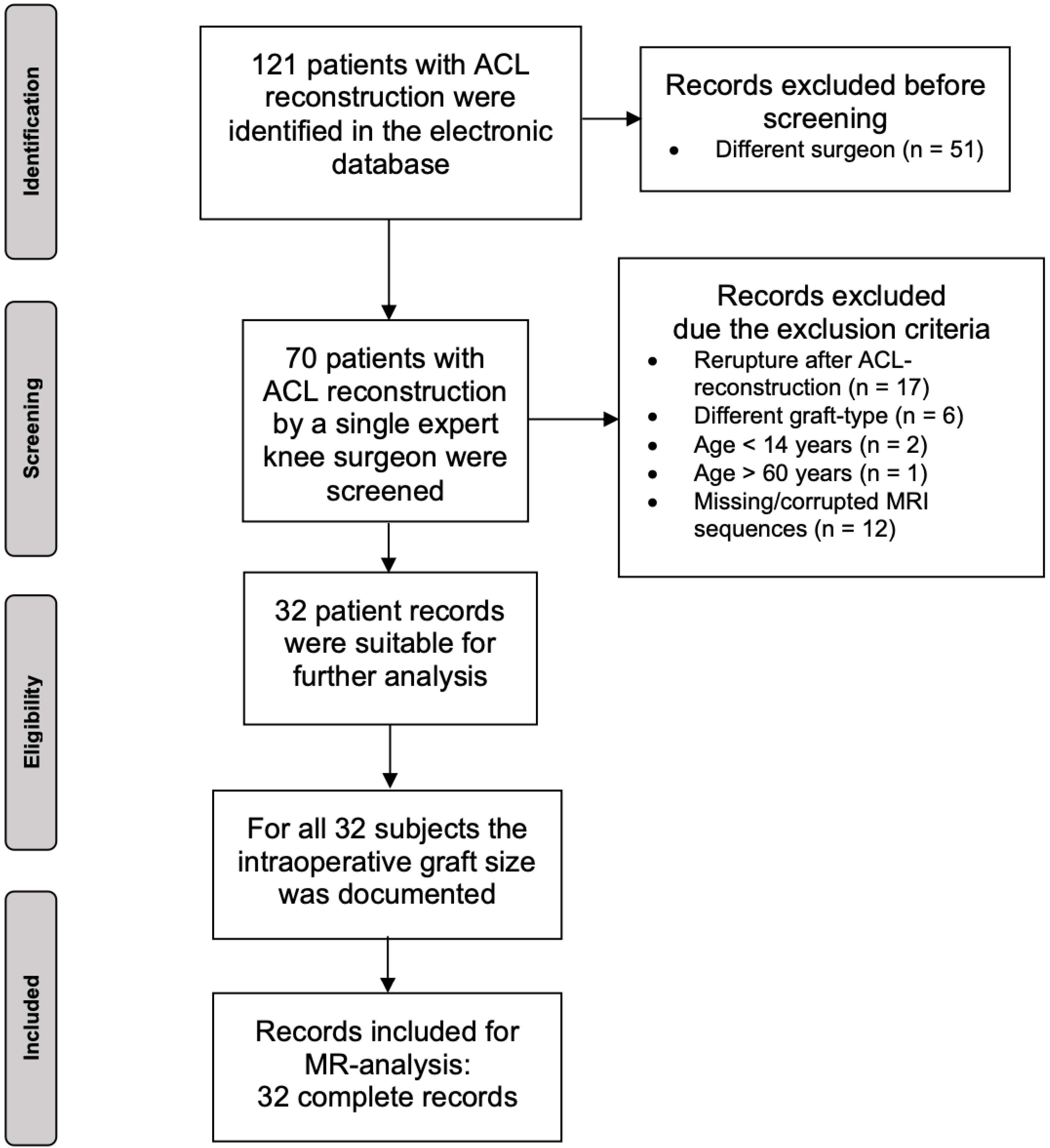 - Hanna, A.; Hollnagel, K.; Whitmer, K.; John, C.; Johnson, B.; Godin, J.; Miller, T. Reliability of Magnetic Resonance Imaging Prediction of Anterior Cruciate Ligament Autograft Size and Comparison of Radiologist and Orthopaedic Surgeon Predictions. Orthop. J. Sports Med. 2019, 7, 2325967119889593. [Google Scholar] [CrossRef]