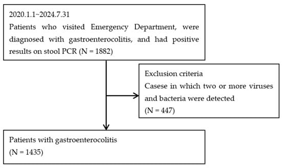 The data of patients who were diagnosed with gastroenteritis by the Emergency Department of Kangwon National University Hospital and tested positive for stool PCR results between 1 January 2020 and 31 July 2024 were used in this retrospective medical chart review. Data regarding demographic characteristics, such as age, sex, and clinical symptoms (body temperature, abdominal pain, nausea, vomiting, diarrhea, and bloody stools) were analyzed. Diarrhea was defined as the passage of 3 or more loose or liquid stools per day (or more frequent passage than is normal for the individual). Other abdominal symptoms, including pain, nausea, and vomiting occurring within three days of hospitalization, were also investigated. Fever was defined as a body temperature of ≥38 °C. Only patients with stool PCR test results available within 24 h of hospitalization were included. Patients were categorized into the bacterial and viral gastroenteritis groups based on the results of real-time PCR. Furthermore, laboratory findings, including the serum PCT levels, C-reactive protein (CRP) levels, white blood cell (WBC) count, stool occult blood, and clinical symptoms, were compared between the groups. Patients with concurrent diagnoses of bacterial and viral infections and those with infections caused by ≥2 bacterial or viral pathogens were excluded to minimize confounding factors. Underlying diseases such as diabetes mellitus, thyroid disease (hyperthyroidism or hypothyroidism), hypertension, cardiovascular disease, respiratory disease, liver disease, renal disease, hyperlipidemia, and surgical history were identified through patient medical history interviews and chart reviews.