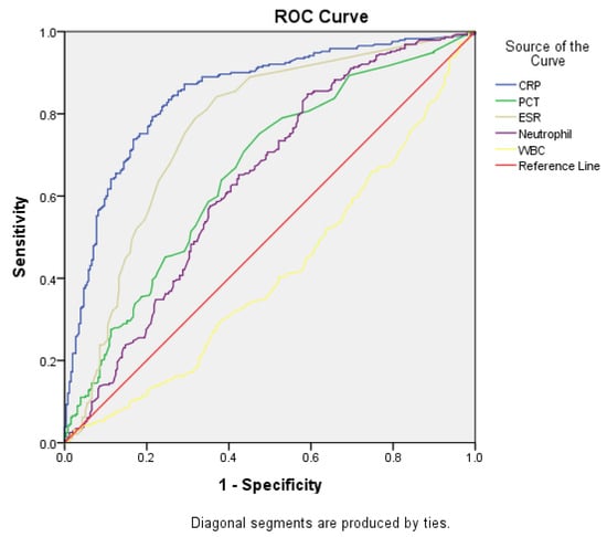Receiver operating characteristic analysis of CRP, PCT, ESR, neutrophil count, and WBC for predicting bacterial gastroenteritis among patients aged > 17 years old with fever (BT ≥ 38 °C).