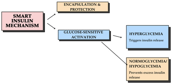 Smart insulin represents a groundbreaking innovation designed to automatically adjust insulin release in response to blood glucose levels. This technology has the potential to improve glycemic management, reduce hypoglycemia risk, and enhance patient quality of life by minimizing the need for frequent insulin injections and dose adjustments [55]. The core technology behind smart insulin involves the encapsulation of insulin molecules in nanocarriers, which function as glucose-sensitive delivery systems. The process works as follows in Figure 1: