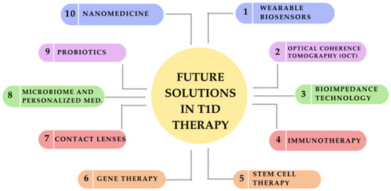 Emerging therapies not only improve the quality of life for individuals with T1D but also provide hope for a future where disease management becomes more efficient and less burdensome [132]. Figure 2 represents a schematic diagram of future solutions for T1D.