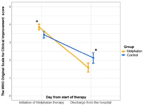 WHO scale (OSCI) dynamics for the mean. *—p < 0.05. Vertical bars denote 0.95 confidence intervals for the mean. Initially, the MG had significantly worse indicators. By the time of discharge, the indicators in the MG were significantly better. A difference in the dynamics of the indicator between groups was revealed.