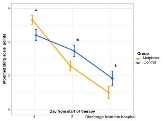 Borg Scale dynamics for the mean. *—p < 0.05. Vertical bars denote 0.95 confidence intervals for the mean. Initially, dyspnea was significantly more pronounced in the MG. By the 7th day of treatment in MG, dyspnea is significantly less present, as well as by discharge.