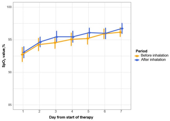 At the time of inclusion in this study, mechanical ventilation was performed in one (1.6%) MG patient and in two (3.3%) CG patients. By the seventh day of therapy, one (1.6%) case of intubation was registered in the MG and two cases in the CG. At subsequent points of observation, intubation was not registered in either group. By the end of the hospital stay in the MG, one (1.6%) patient was extubated and one (1.6%) patient died. In the CG, one (1.6%) patient was extubated and two (3.3%) patients died. Thus, by the end of the hospital stay, in the MG, 96.7% of patients did not undergo mechanical ventilation versus 96% in the CG. No AEs possibly related to MEL inhalation were reported in the trial. All inhalations were well tolerated, no specific signs/symptoms were reported, and no patients were withdrawn from inhalation treatment. Against the background of therapy in the MG, there was no decrease in the SpO2 level immediately after inhalation administration of MEL, and despite that, oxygen flow during inhalation remained unchanged (shown in Figure 3).