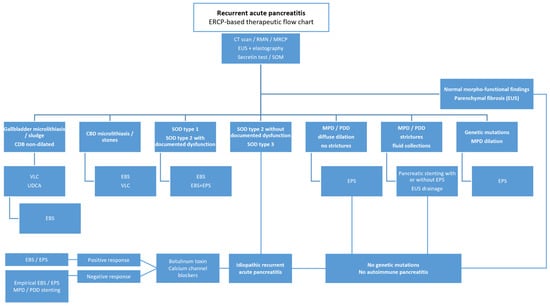 EBS is the intervention of choice in RAP of biliary etiology when pancreatitis recurs after cholecystectomy. EBS can also be proposed as the first therapeutic step, instead of cholecystectomy, when CBD stones/microlithiasis are documented; in these cases, the gallbladder “in situ” has not been found to be a significant risk factor for complications after EBS, although this was hypothesized. Recurrence of pancreatitis was reported in 18% of cases after EBS with gallbladder “in situ”, while no recurrences were reported after both cholecystectomy and EBS [30]. Endoscopic papillary balloon dilation (EPBD) may be used as an alternative to EBS to remove CBD stones. This technique was found to be associated with lower complication and stone recurrence rates compared to EBS (5.3% vs. 17.3% and 4.4% vs. 12.7 for stones ≤ 8 mm) [31]. The incidence of post-ERCP pancreatitis (PEP) did not differ after EPBT and EBS in most studies assessing this [32]. EPBD is not indicated when CBD stones are not found or SOD is suspected.
