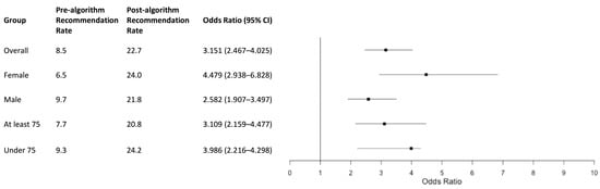 Patients under 75 years old had higher recommendation rates in both groups (pre-algorithm: 9.3%; post-algorithm: 24.2%) compared to those 75 years or older (pre-algorithm: 7.7%; post-algorithm: 20.8%) (Figure 1). However, the rates increased post-algorithm for both age groups. The OR of recommendation post- vs. pre-algorithm was 3.986 (95% CI: 2.216–4.298, p < 0.0001) in patients under 75 and 3.109 (95% CI: 2.159–4.477, p < 0.0001) in patients 75 and older (Figure 1). Both male and female patients showed increased recommendation rates post-algorithm, with a more pronounced improvement in females (Figure 1).