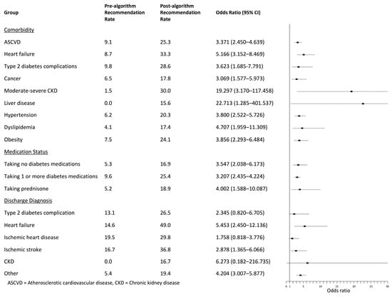 Patients taking no diabetes medications had lower rates of recommendation in both groups (pre-algorithm: 5.4%; post-algorithm: 17.0%) compared to those regularly taking at least one diabetes medication (pre-algorithm: 9.6%; post-algorithm: 25.4%) (Figure 2). The OR of recommendation post- vs. pre-algorithm was 3.547 (95% CI: 2.023–6.173, p < 0.0001) in patients taking no diabetes medications and 3.207 (95% CI: 2.435–4.224, p < 0.0001) in patients taking at least one diabetes medication (Figure 2). Patients taking prednisone regularly had lower recommendation rates in both the pre- and post-algorithm groups (pre-algorithm: 5.2%; post-algorithm: 19.0%) compared to patients not taking prednisone (pre-algorithm: 8.8%, post-algorithm: 23.2%) (Figure 2). However, the rates increased post-algorithm for both prednisone status groups, as the OR of recommendation post- vs. pre-algorithm was 4.002 (95% CI: 1.588–10.087, p = 0.0033) in patients taking prednisone and 3.113 (95% CI: 2.414–4.014, p < 0.0001) in patients not taking prednisone (Figure 2).