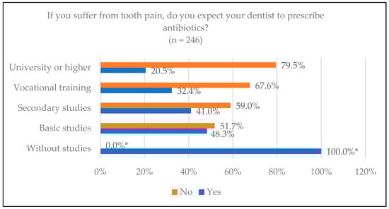 Patients who believe they should take antibiotics for dental pain according to their educational level. * Statistically significant differences.