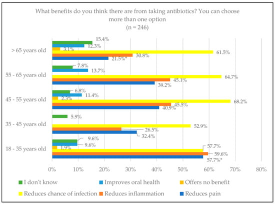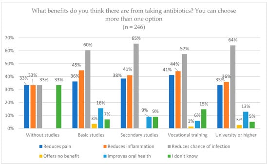 Regarding the benefits of taking antibiotics, pain reduction was the variable with the greatest difference, and the reduction in the possibility of infection was the most selected by almost all the age groups, as shown in Figure 2. In the 18–35 age range, 57.7% chose this variable, compared to 21.5% of those over 65, with significant differences (p = 0.002). Regarding educational level, in terms of reducing the possibility of infection, only 33.3% of the uneducated group chose this option, the lowest percentage compared to the other groups, with no significant differences (p = 0.711) (Figure 3).