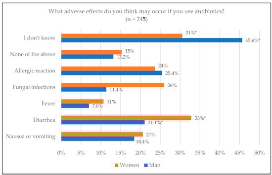 Regarding perceptions of adverse effects that antibiotics can cause, we analyzed the responses of 245 participants, excluding the gender “Other” due to its low representation. Fifty-two (45.6%) of men out of the total (n = 114) marked the option “I don’t know”, the most chosen option for the gender; while in the case of women, 40 (30.5%) out of the total (n = 131) chosen this option, with significant differences (p = 0.015) (Figure 4). The diarrhea option was, in this case, the most chosen by women, specifically by 43 (32.8%) of those surveyed, as opposed to 24 (21.1%) men, with significant differences (p = 0.039).