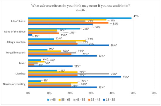Adverse effects of antibiotics from patient knowledge according to age. * Statistically significant differences.