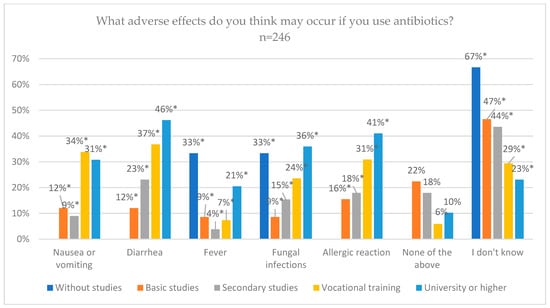 Adverse effects of antibiotics from patient knowledge according to educational level. * Statistically significant differences.