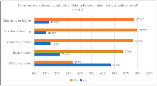 Having ever self-medicated with antibiotics before or after tooth extraction by educational level. * Statistically significant differences.