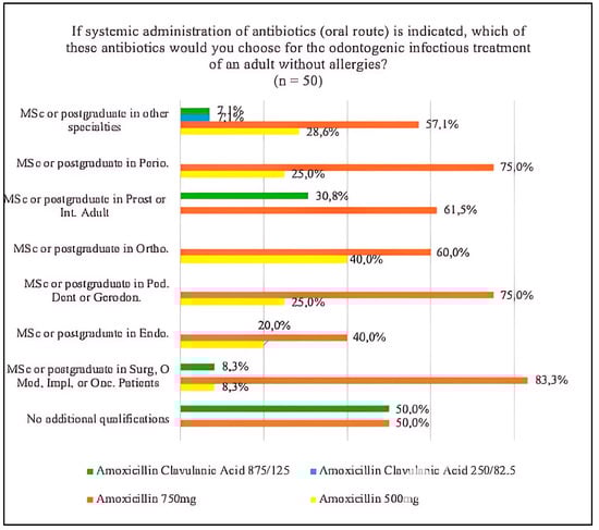 Drug choice in the systemic administration of antibiotics (oral route) in relation to specialty. Abbreviations in the figure: MSc (master’s), Postgraduate (pg), Perio. (periodontics), Prost. (prosthodontics), Int. Adult. (adult comprehensive dentistry), Ortho. (orthodontics), Ped. Dent. (pediatric dentistry), Gerodon. (gerodontology), Endo. (endodontics), Surg. (surgery), Med. (medicine), Impl. (implants), Onc. Patients (oncological patients).