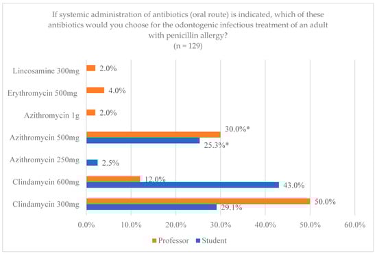 Drug choice by professors and students for the treatment of infections for adults with allergies. * Statistically significant differences.