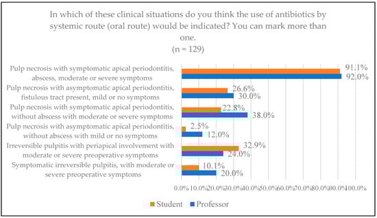 With respect to the clinical situations for the prescription of antibiotics, 72 (91.1%) of the students and 46 (92%) of the professors indicated that they would prescribe the drug for “Pulp necrosis with symptomatic apical periodontitis, abscess, moderate or severe symptoms”, being the most chosen option by both groups, with non-significant differences (p = 0.865). Of 92% of the total number of professors (n = 50), 100% of each specialty chose this option, except in the case of professors with a master’s or postgraduate degree in prosthetics or integrated adult prosthetics, which numbered 12 (92.3%), with non-significant differences (p = 0.731).