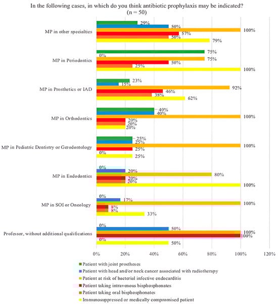For the indication of antibiotic prophylaxis in clinical situations, “Patient at risk of bacterial endocarditis” was the most chosen option by most of the specialties, exceeding 80% in all, including professors without additional qualifications. The second most marked situation was “Patient immunosuppressed or medically compromised” by 60% of the professors. The least chosen was “Patient with joint prostheses” with 24%, with 0 (0%) professors without additional qualifications, a master’s or postgraduate degree in surgery, oral medicine, implantology or oncology patients and a master’s or postgraduate degree in endodontics, with significant differences (p = 0.002) (Figure 11).