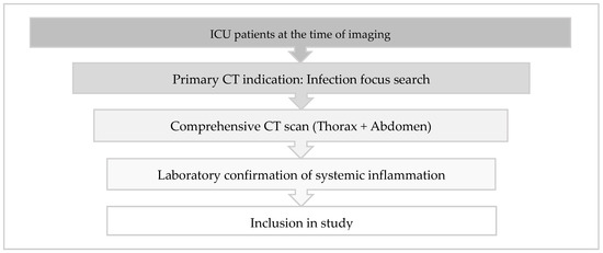 This prospective study enrolled ICU patients between July 2016 and October 2018 who underwent combined chest and abdominal CT scans to investigate potential unidentified inflammatory foci. Patient selection followed a structured three-step inclusion process to ensure clinical relevance and homogeneity.
