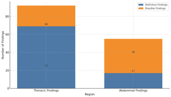 The study identified 92 focus findings (62.6%) within the thoracic region and 55 focus findings (37.4%) in the abdominal region. A detailed analysis of these findings indicated a significant dichotomy in diagnostic certainty. In the thoracic area, 69 foci (75%) were definitively characterized as inflammatory, while 23 (25%) were classified as possible. In contrast, abdominal foci demonstrated a higher degree of diagnostic uncertainty, with only 17 (30.9%) categorized as definite and the majority, 38 (69.1%), as possible (refer to Figure 2).