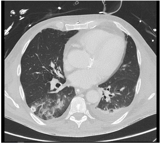A 26-year-old intensive care patient with elevated inflammatory markers. Typical morphologic signs of pneumonia in the right lower lobe are evident, including ground-glass opacity (GGO), bronchial wall thickening, and pleural effusion.