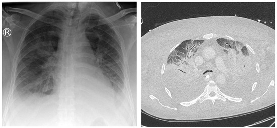 A 75-year-old patient with a focus of unknown origin and uncertain signs of pneumonia on preliminary radiography. Left: Radiograph showing bilateral opacities in the central and inferior fields. Right: CT scan showing extensive bilateral pulmonary infiltrate and pleural effusion.
