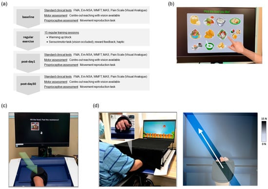 Eligible participants completed a baseline assessment, followed by 15 sessions of robotic-based intervention and post-training assessments, as illustrated in Figure 1a. Each gamified intervention lasted for approximately an hour, conducted 3 days per week over 5 weeks, and was always attended by a trained therapist. The session started with a warm-up exercise, joint-approximation exercise, followed by sensorimotor training. In the initial session, some practice trials were provided to help the participants understand each task. The therapist also maintained a diary containing the participant’s comments, incidental observations, or unforeseeable adverse events.