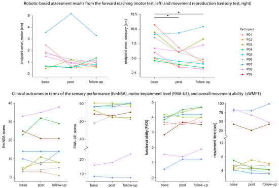 Changes in robotic assessment indices of motor and sensory tests, and upper limb clinical scores for the sensory (Em-NSA), motor impairment (FMA-UE), and functional ability (functional ability score—FAS and movement time of the streamlined WMFT), before and after training for each participant. The higher the ordinal scores, the better the performance outcome. As for the MT, a smaller number (in seconds) means better improvement. The * in the top panel denotes p < 0.05.