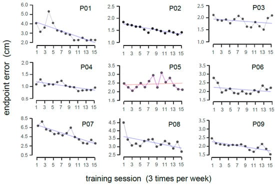 Deviation between the actual and perceived target locations during training, with Pxx representing individual participants. A linear fit was applied to the data points, where the purple line indicates a reduction in endpoint error (signifying improved movement accuracy), and red line denotes no obvious improvement over time.
