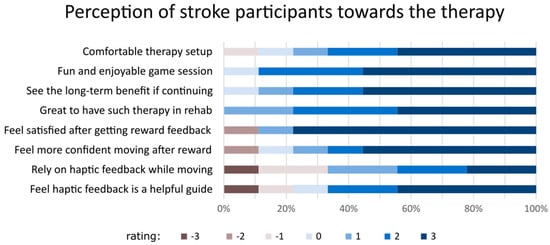 The perception of stroke participants about the training sessions they attended using a Likert scale questionnaire. The rating ranges from 3 (the most agreeable) to −3 (least agreeable).