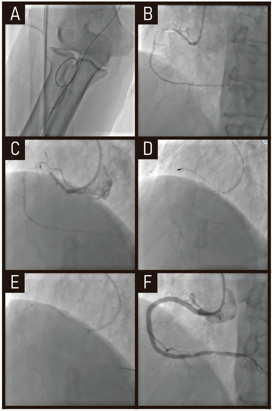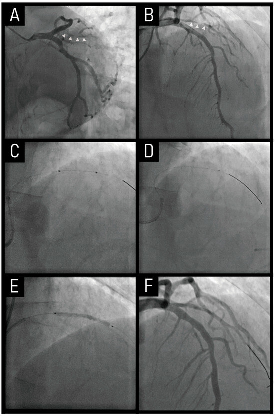 A 63-year old male presented with a one-week history of resting chest pain. His past medical history was treated hypertension. Invasive coronary angiography revealed a long-segment, severe (99%) stenosis in the first diagonal branch (Figure 3A,B). An initial attempt with a 2.0 mm plain balloon failed to cross the lesion (Figure 3C). Even after inflating a 1.5 mm plain balloon, the Finecross microcatheter was still unable to advance across the lesion (Figure 3D).