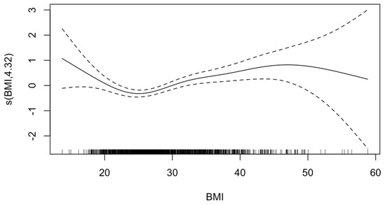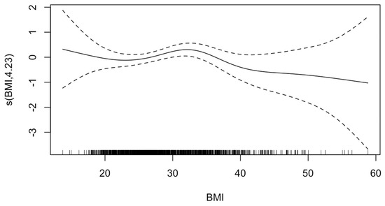 To explore the effect of BMI on stroke as a continuous variable and to identify the BMI range with the greatest predicted risk of stroke, we performed a generalized additive model (GAM) analysis. This enabled us to capture potential non-linear relationships between BMI and stroke risk, using smoothing splines while controlling for patient demographics and clinical variables. We then performed multivariable regression to assess the association between BMI categories and stroke risk, adjusting for clinically relevant covariates. The normal weight BMI category was treated as the reference group. Odds ratios (ORs) with 95% confidence intervals (CIs) were calculated.